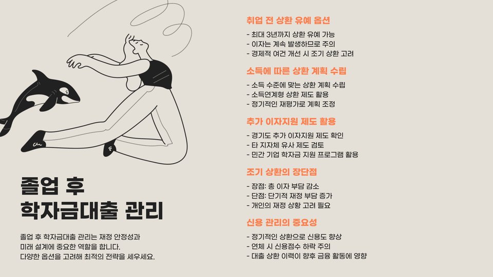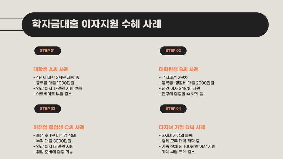 - 이자 지원은 졸업 후 일정 기간 내에 반환되어야 하며, 각 개인의 조건에 따라 다름.