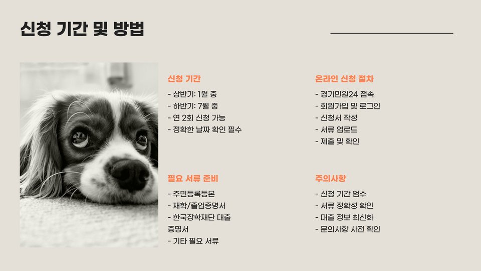 - 신청 방법은 온라인이며, 필요한 서류는 본인 확인 및 대출 증명서 등임.