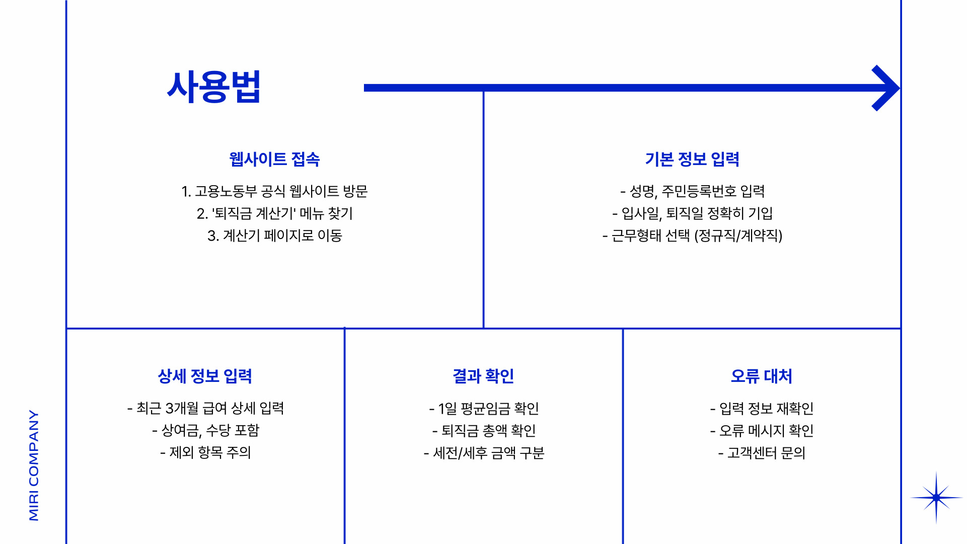 고용노동부에서는 퇴직금 계산기를 제공하여 퇴직금을 쉽게 계산할 수 있도록 돕고 있습니다. 이를 이용하면 직접 계산할 필요 없이 간단하게 결과를 얻을 수 있습니다. 사용 방법은 다음과 같습니다: