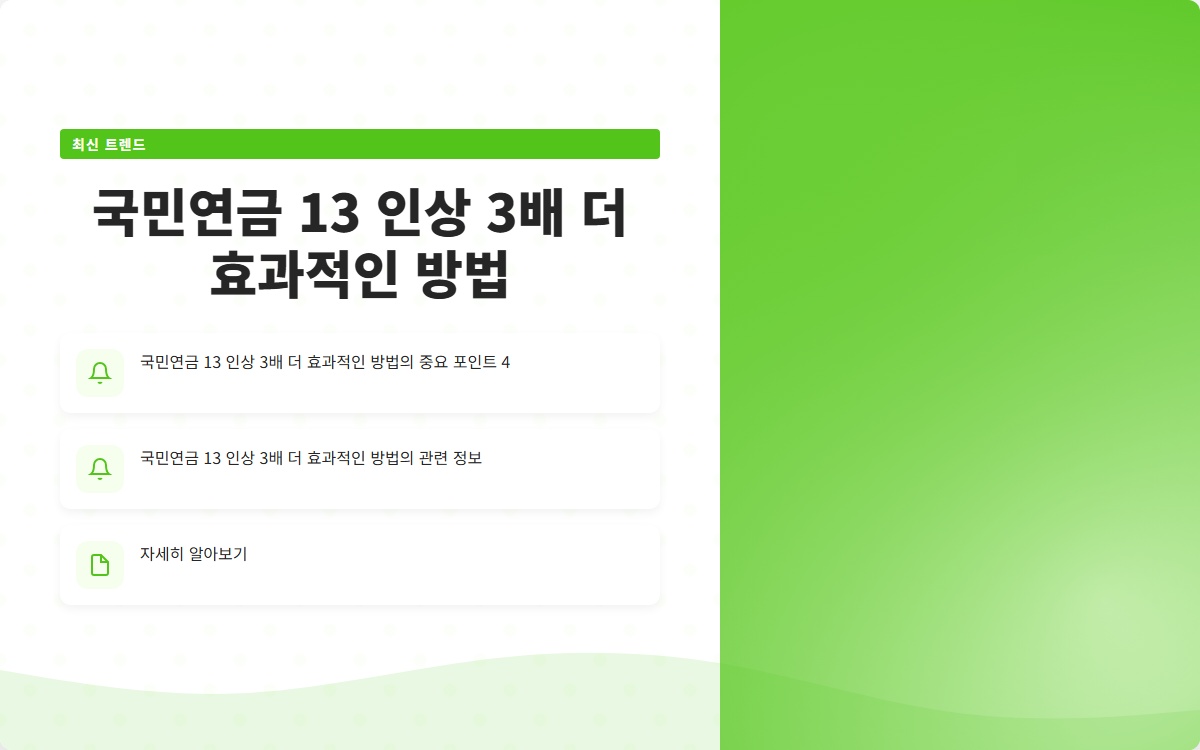 2025년부터 국민연금 보험료가 9%에서 13%로 인상됩니다. 과연 이러한 변화가 국민에게 어떤 영향을 미칠까요? 근로자와 자영업자 모두에게 경제적 부담이 커질 것으로 예상되는데, 이에 대한 대안은 무엇일까요? 지금 확인해보세요!