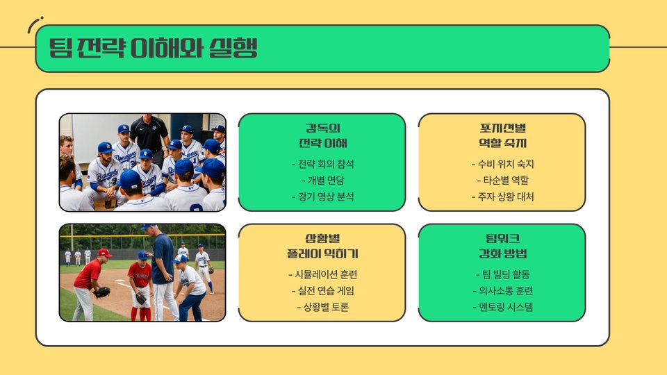 예를 들어, 한 외야수는 타자의 타격 스타일에 따라 자신의 위치를 미세하게 조정합니다. 이렇게 상황을 정확히 판단하고 대처하는 능력은 여러 차례의 실전 경험을 통해 쌓인 것입니다. 수많은 게임을 통해 팀의 전술을 몸으로 익히고 개인의 전투력을 극대화하는 것이 핵심입니다.