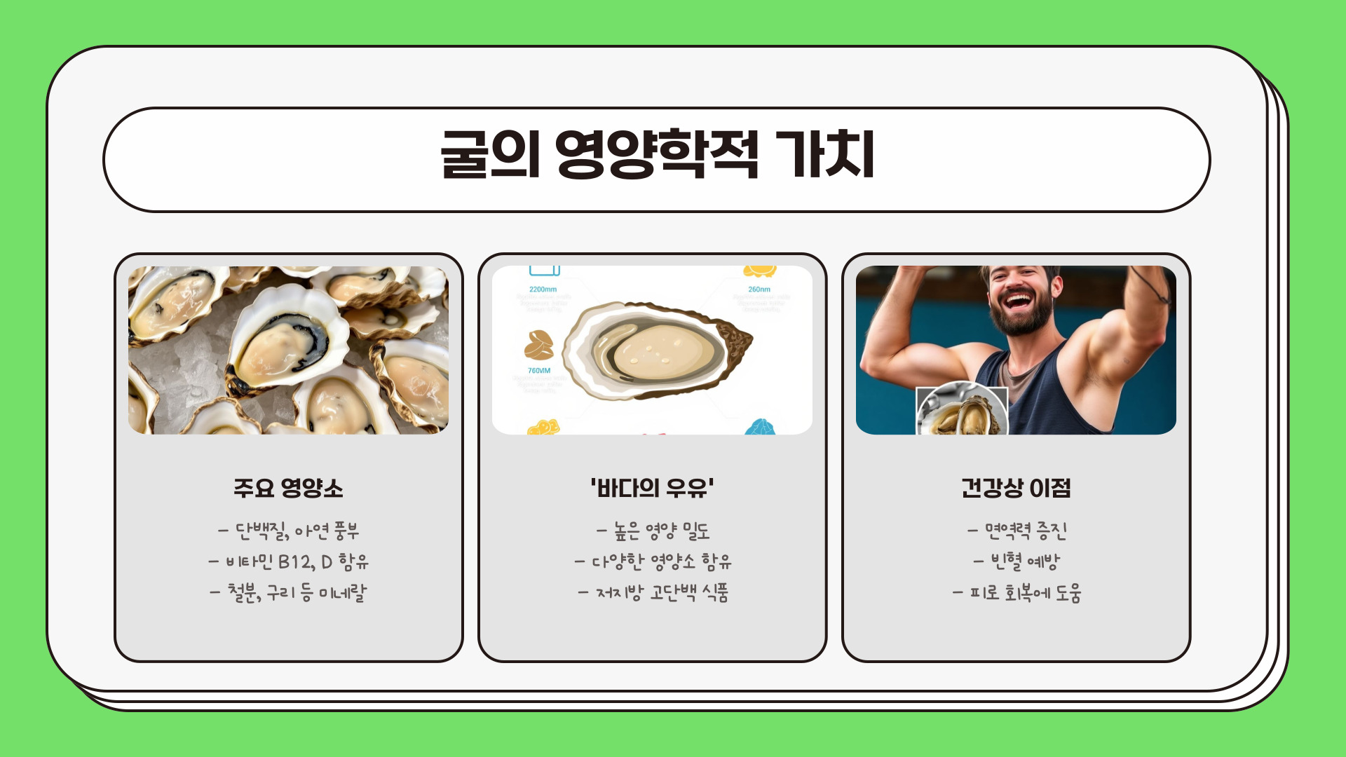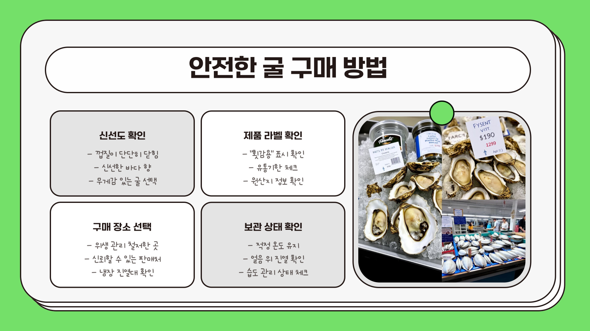 굴을 먹을 때는 항상 안전하게 조리하는 방법을 기억해야 합니다. 특히, 생굴을 먹을 때는 반드시 '가열조리용'으로 표시된 제품을 선택하고, 85℃에서 1분 이상 가열하여 섭취하는 것이 좋습니다. 이렇게 함으로써 노로바이러스와 같은 병원균의 위험을 줄일 수 있습니다. 날 것으로 먹는 대신 요리된 굴을 선택하는 것이 훨씬 안전합니다.