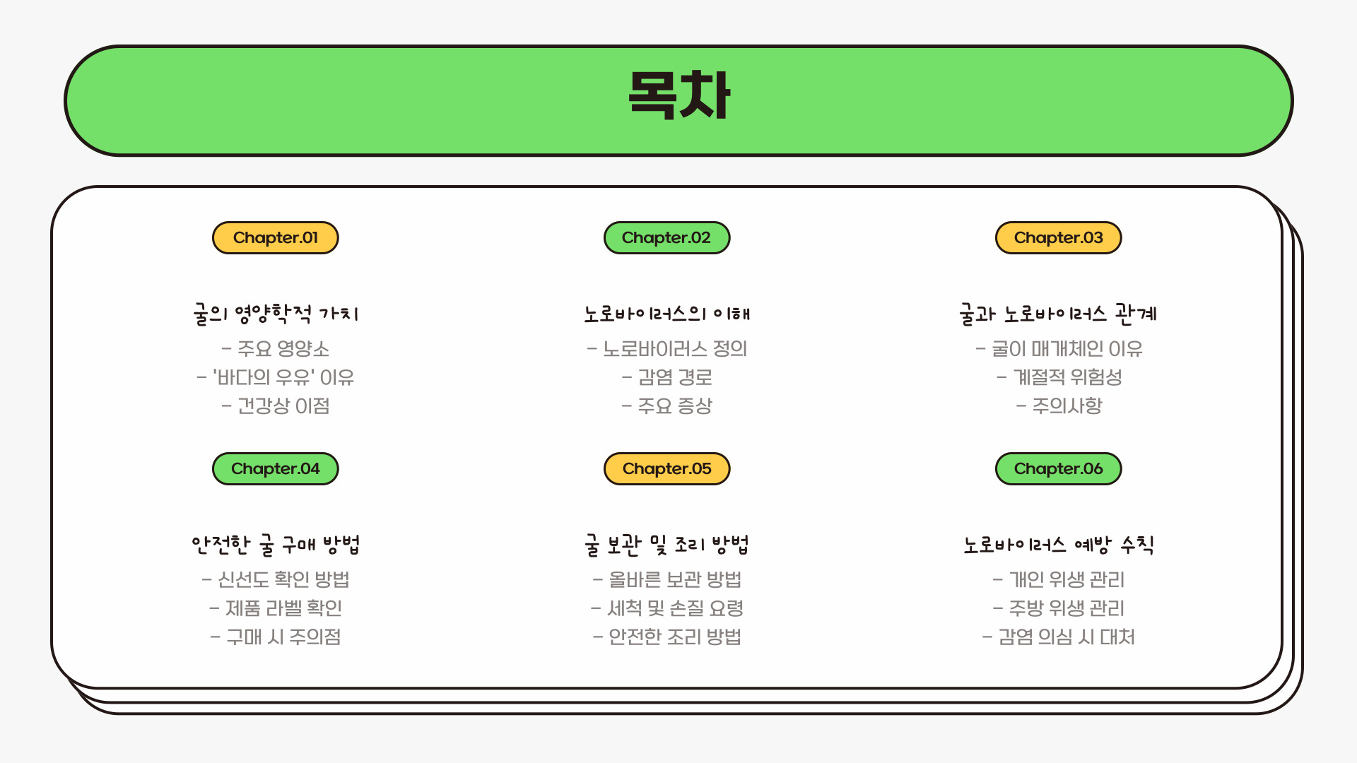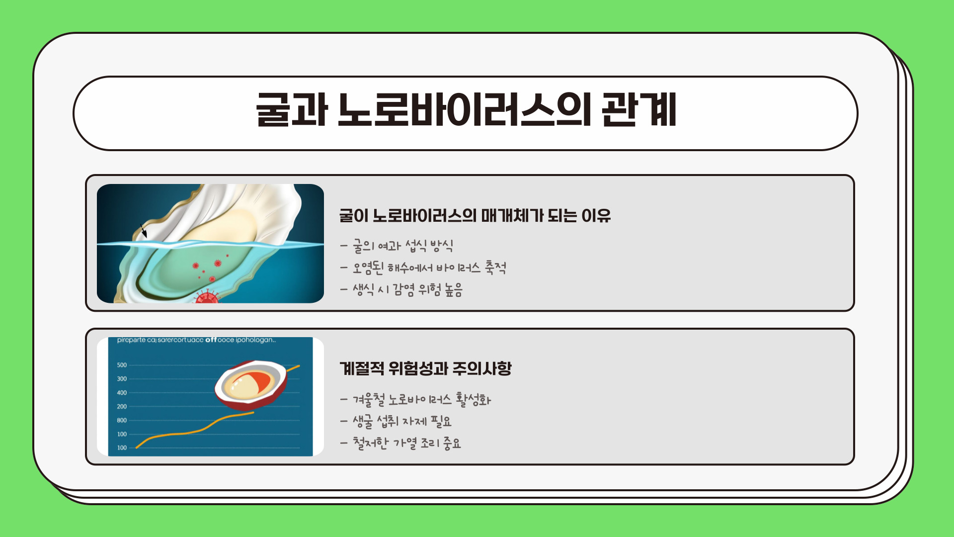 노로바이러스에 대해 알고 계셨나요? 겨울철 신선한 굴을 즐기면서도 감염의 위험을 피하기 위해서는 사전 예방이 무엇보다 중요합니다. 오늘 소개한 꿀팁을 참고하셔서 안전하고 건강하게 겨울철 음식 문화를 누리시기 바랍니다.