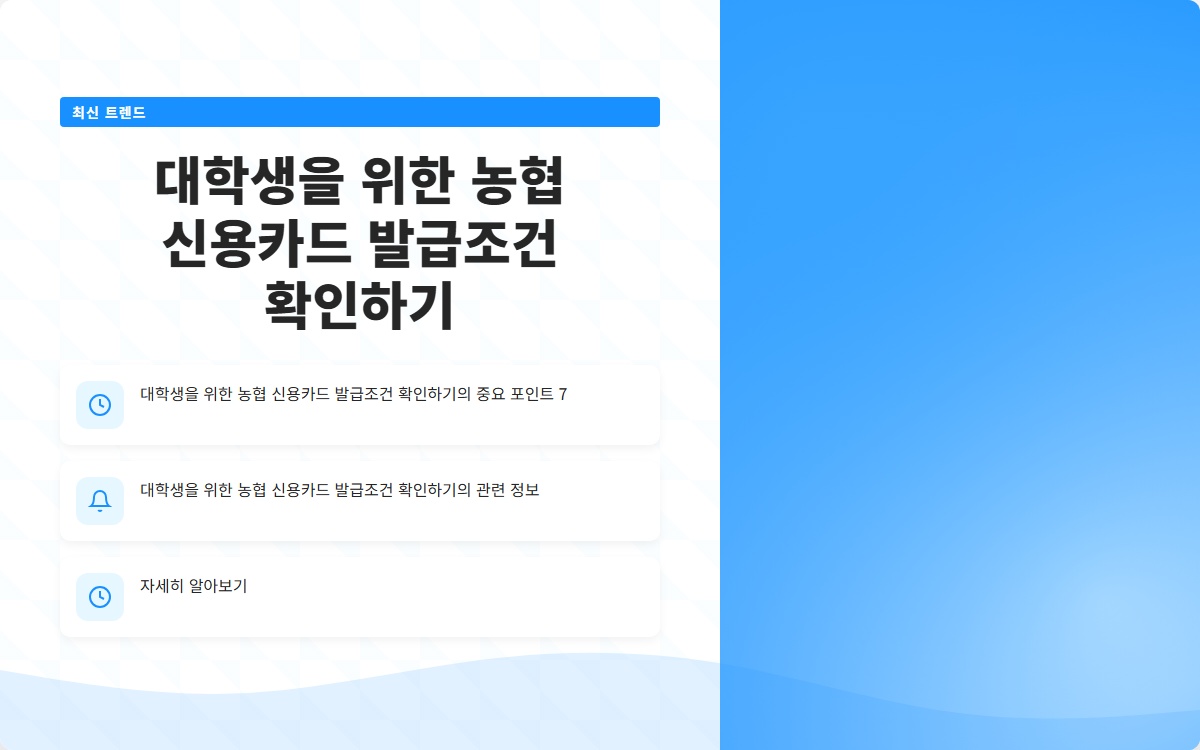 대학생들이 신용카드를 발급받으려면 여러 가지 조건을 충족해야 합니다. 신용카드는 일상 생활에서의 편리함을 제공하지만, 발급 조건을 잘 아는 것이 중요합니다. 특히 농협 신용카드는 대학생들에게 적합한 다양한 혜택을 제공하므로 많은 학생들이 관심을 가지고 있습니다. 이 글에서는 농협 신용카드의 발급 조건을 자세히 알아보겠습니다.