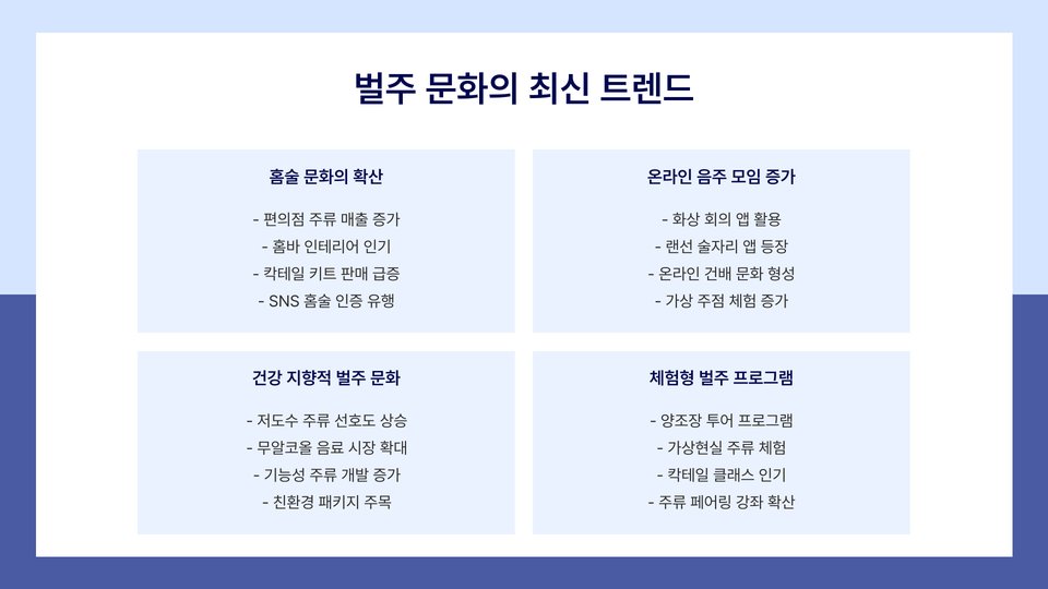최근에는 건강한 라이프스타일을 추구하는 사람들이 늘어나면서 벌주에 대한 관심이 높아지고 있습니다. 특히, 자연식품이나 유기농 제품에 대한 선호가 증가함에 따라, 벌주는 이러한 트렌드에 부합하는 건강 음료로 자리잡고 있습니다.