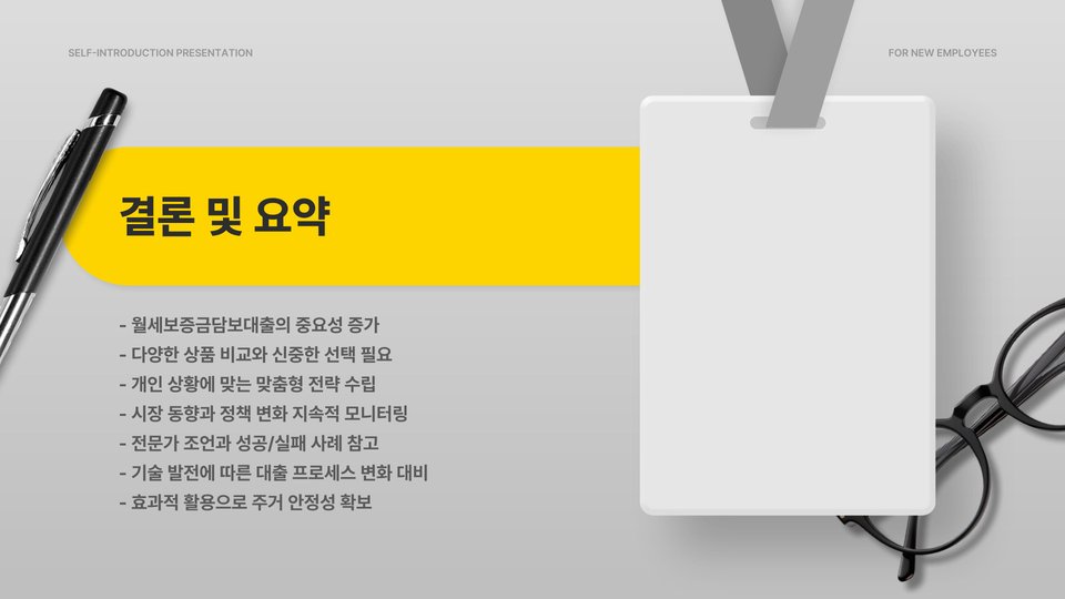 보증금 월세보증금담보대출은 현대인의 주거 문제를 해결하는 데 큰 역할을 하고 있습니다. 이 대출 방식은 경제적인 부담을 줄이면서도 안전한 주거 환경을 마련하는 데 기여하고 있습니다. 그러나 신중한 대출 선택과 철저한 준비가 요구됩니다. 불확실한 시장에서 안정적이고 지혜로운 결정이 필요하며, 대출 상품을 잘 활용하는 것이 매우 중요합니다.
