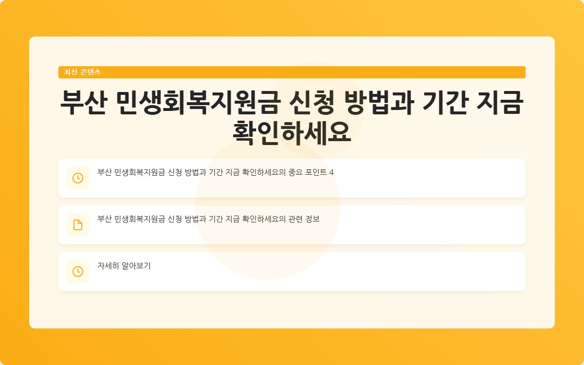 부산 민생회복지원금은 많은 국민들에게 절실한 지원이 될 것입니다. 필요한 정보를 정확하게 파악하고, 신청 기간에 놓치지 않도록 유의하세요. 지금 바로 신청 방법과 기간을 확인해 보세요!