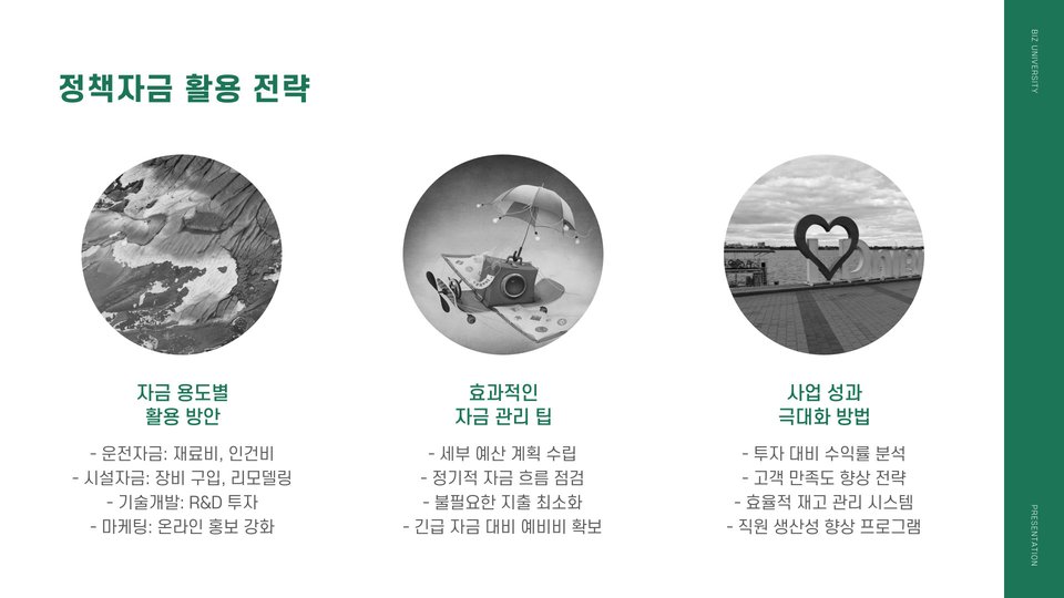 정책자금이 승인되면, 실제로 자금을 어떻게 활용할 것인지에 대한 계획이 필요합니다. 예를 들어, 자금을 통해 구매할 장비나 원자재를 미리 리스트업하고, 필요한 경우에는 전문 컨설턴트의 도움을 받는 것이 좋습니다. 자금의 사용 내역은 반드시 기록해야 하며, 향후 회계 처리에 활용됩니다. 특히, 자금 사용에 대한 정기적인 보고 의무가 있을 수 있으므로, 이 부분도 염두에 두어야 합니다.
