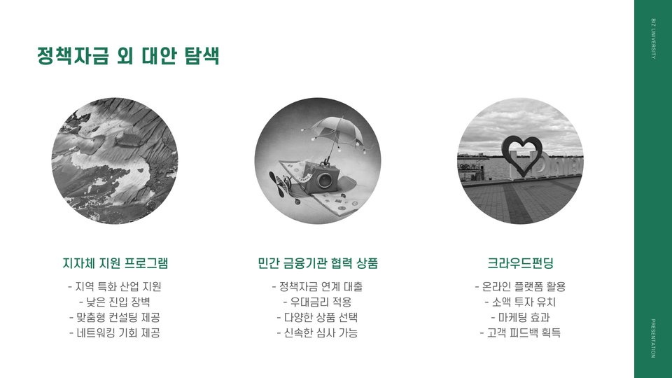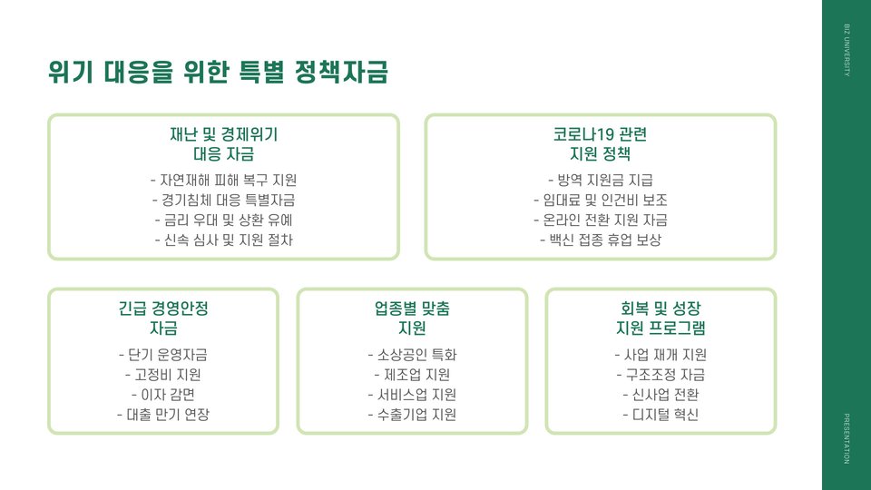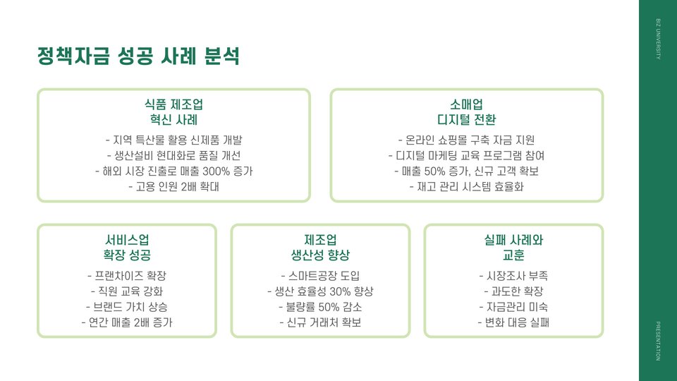 | 정책자금 종류 | 대출, 보조금, 투자 |