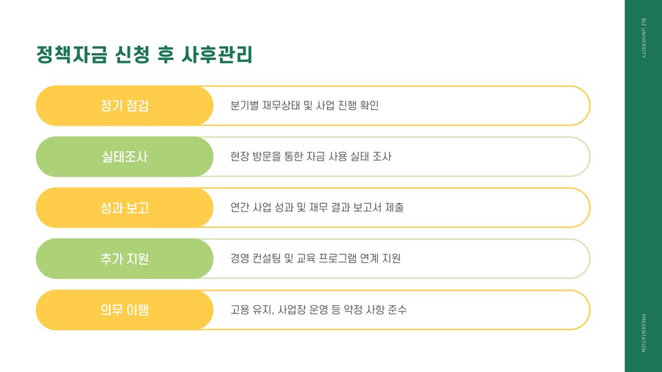 정책자금을 성공적으로 신청하고 받았다면, 이제 자금을 효율적으로 관리하는 것이 중요합니다. 자금의 활용을 위한 계획서를 기반으로 지출 항목을 체계적으로 관리해야 합니다. 이는 향후 자금 사용의 투명성을 높이고, 불필요한 지출을 방지하는 데 큰 도움을 줍니다.