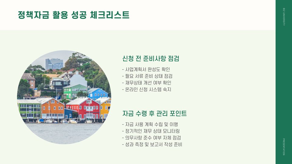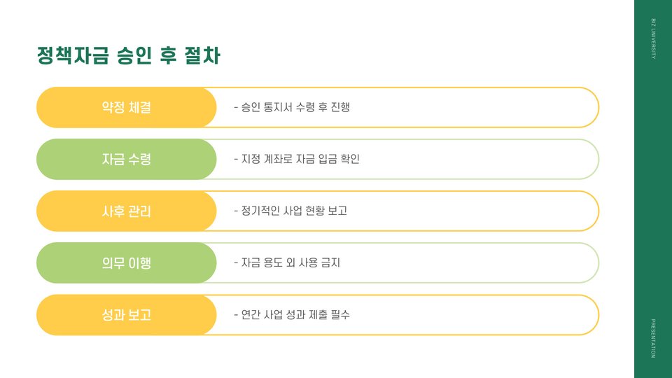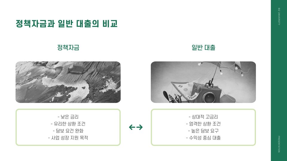 정책자금은 주로 대출, 보조금, 그리고 투자로 나눌 수 있으며, 각 지원 유형은 그 용도와 조건이 다릅니다. 예를 들어, 대출의 경우 이자율이 상대적으로 낮고, 상환 기간이 길어 유연한 자금 운영이 가능합니다. 반면 보조금은 상환 의무가 없지만 지원 조건이 까다로울 수 있습니다.