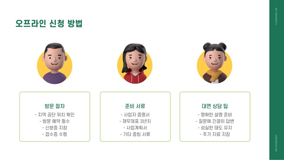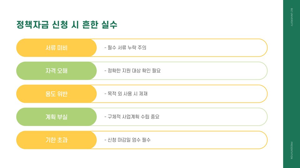 신청 시 주의해야 할 점은 정확한 정보 입력입니다. 잘못된 정보는 심사를 지연시키거나 불승인 사유가 될 수 있습니다. 또한 신청 마감일을 확인하여 기한 내에 신청을 완료하는 것도 중요합니다. 마지막으로, 지원 자금의 용도에 맞는 사업을 운영해야 한다는 점도 기억해야 합니다.