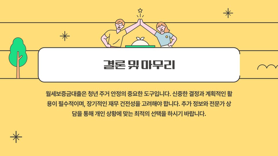 종합적으로, 카카오의 월세보증금대출은 저렴한 금리, 간편한 대출 절차, 유연한 상환 조건이라는 3가지 주요 혜택을 통해 많은 이들에게 도움이 되고 있습니다. 이러한 혜택을 통해 주거비 부담을 줄이고, 더 나은 주거 환경을 조성할 수 있습니다. 즉시 실행 가능한 이 대출 상품을 고려해보는 것은 매우 현명한 선택이 될 것입니다.