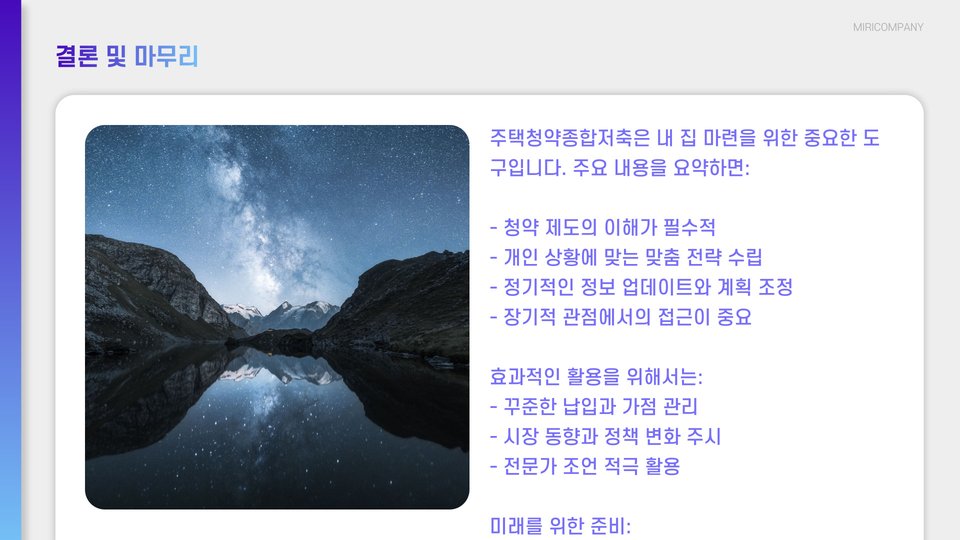 결론적으로, 주택청약종합저축은 주택 구매를 위한 고려해야 할 유리한 상품입니다. 철저한 사전 조사와 계획을 통해 성공적인 주택 구매를 이루기 바랍니다.