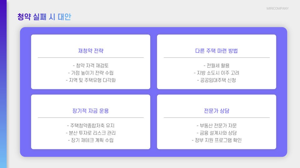 둘째, 청약 통장에 쌓이는 점수는 저축 금액뿐만 아니라 가입 기간에 따라 달라집니다. 따라서, 가급적 빨리 가입하고 장기적으로 저축하는 것이 유리합니다. 셋째, 청약에 성공하더라도 주택을 구매할 수 있는 자금이 준비되어 있어야 하며, 대출을 고려해야 할 경우 신중하게 계획해야 합니다.