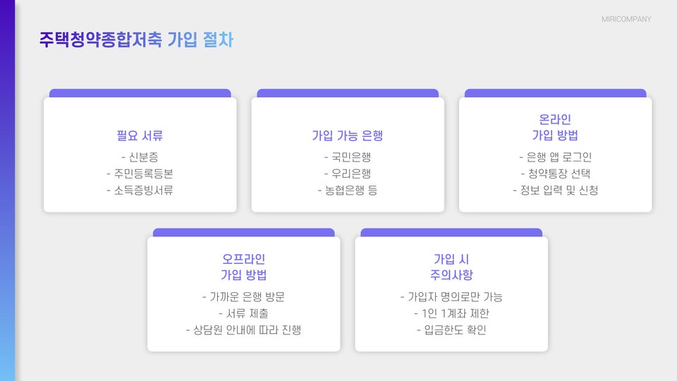 주택청약종합저축은 은행을 통해 가입할 수 있으며, 기본적으로 필요한 서류는 신분증과 소득증명서입니다. 가입자는 원하는 금액만큼 매달 저축할 수 있으며, 최소 금액과 최대 금액은 각 금융기관 정책에 따라 다를 수 있습니다. 가입 방법은 아주 간단하지만, 각각의 금융기관에서 제공하는 상품의 조건을 비교하는 것이 좋습니다.