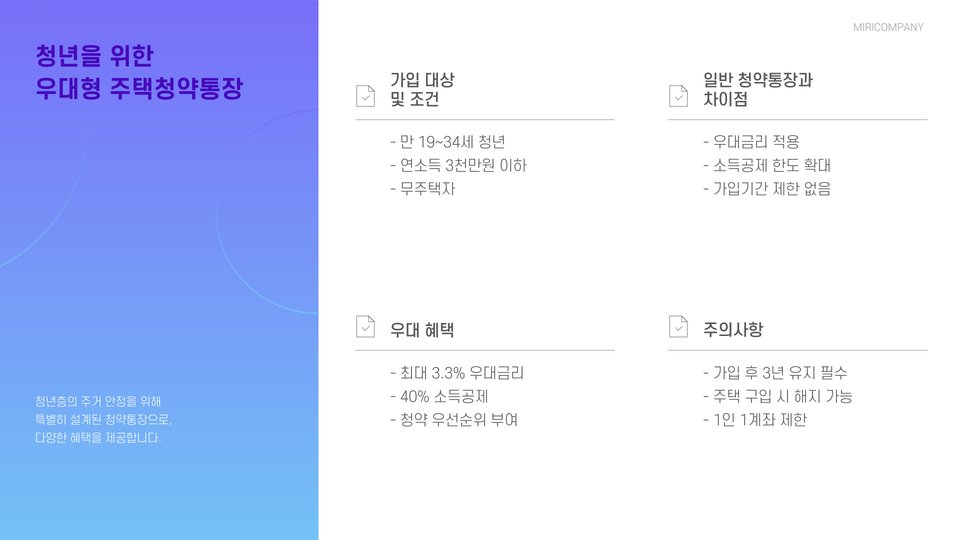 • 정부 지원의 저축상품으로 주택구입 자금 마련에 효과적입니다.