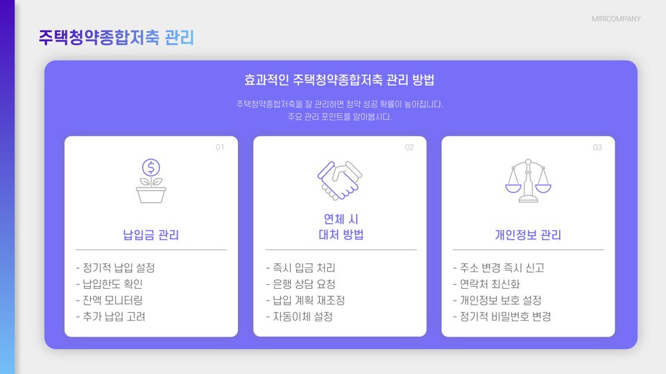 가입 후에는 매달 정해진 금액을 저축하면 됩니다. 이때, 주의할 점은 최소 저축 금액을 반드시 준수해야 하며, 잔액이 부족할 경우 청약 자격에 영향을 미칠 수 있다는 것입니다. 따라서, 정기적으로 자신의 통장 상태를 점검하는 것이 중요합니다.