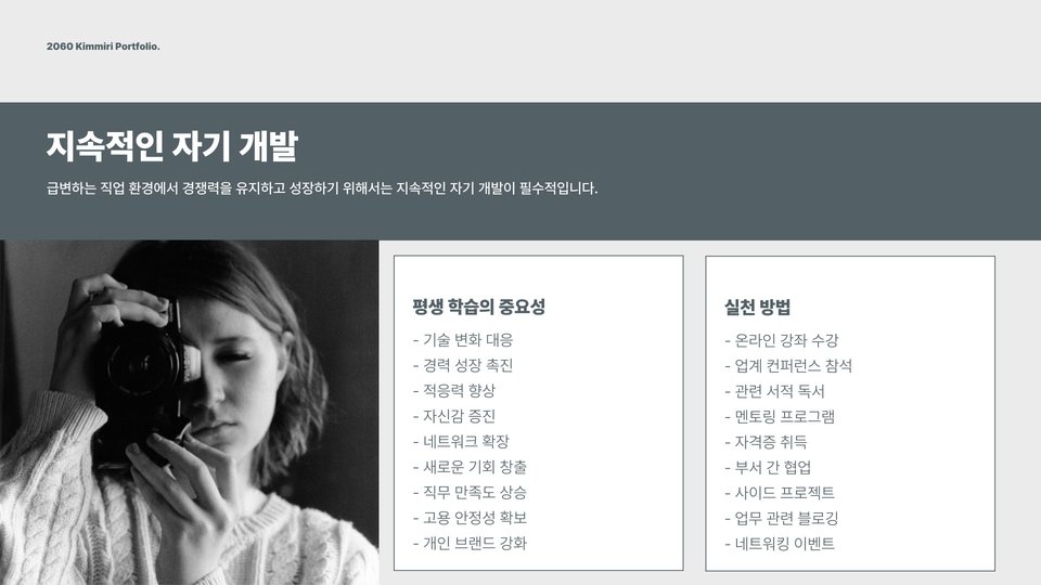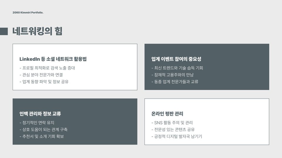 | 네트워킹 | 다양한 행사 참여로 인맥 형성 |