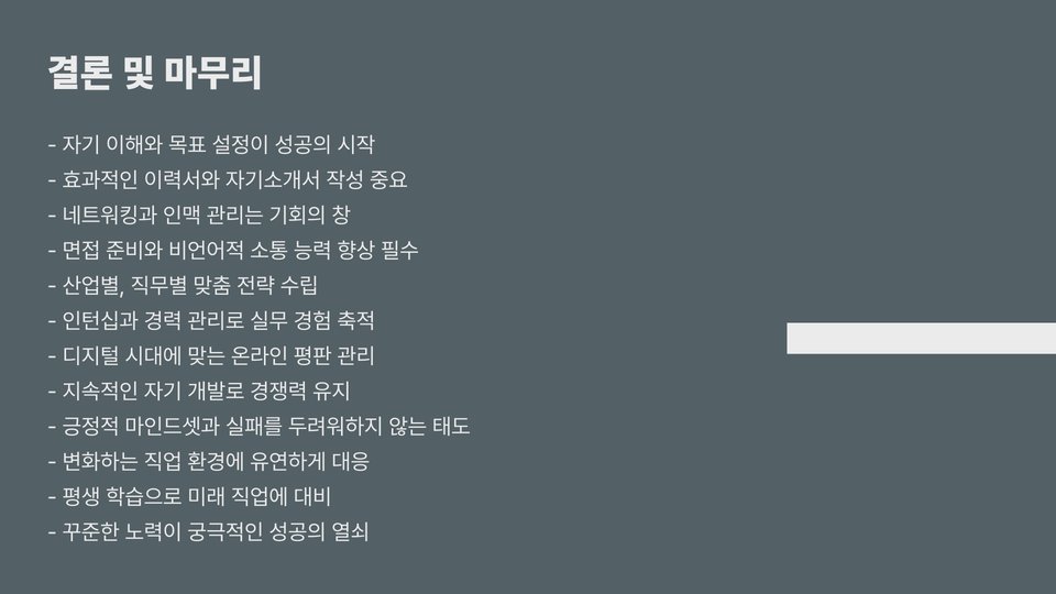 이러한 모든 과정이 모여 여러분의 취업 성공으로 이어질 것입니다. 항상 긍정적인 마인드를 유지하며, 끊임없이 노력하는 자세가 필요합니다.