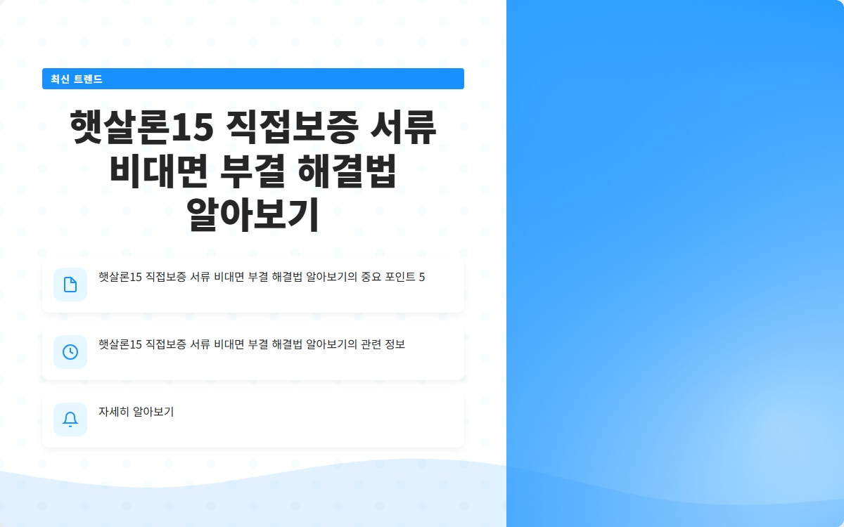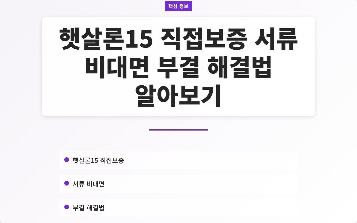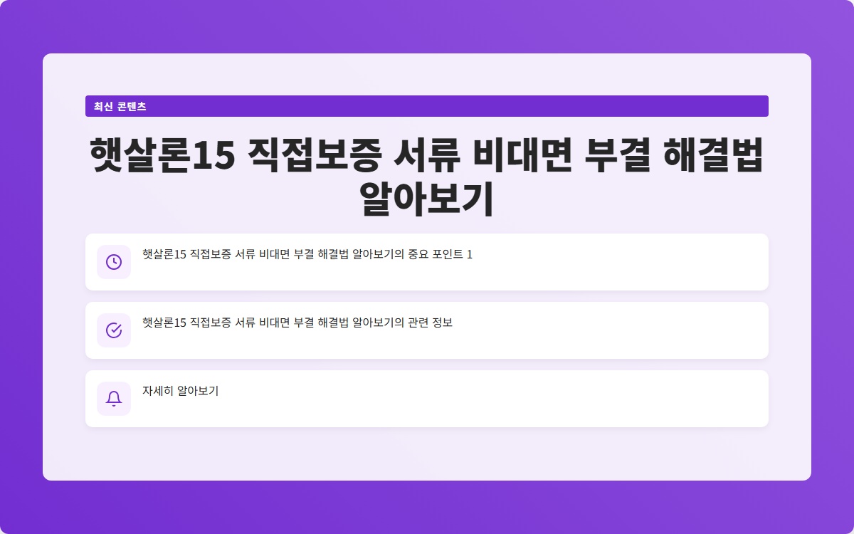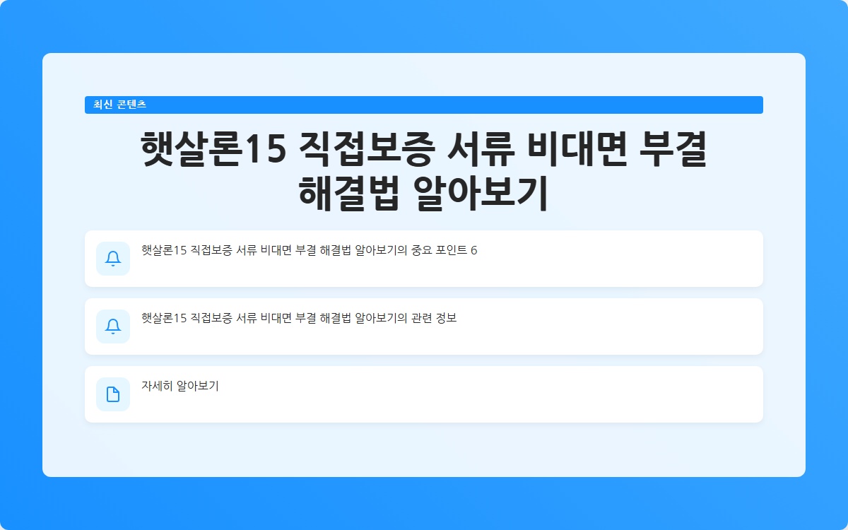 햇살론15 직접보증 비대면 신청 시 부결 문제를 해결하기 위해서는, 서류 준비가 필수적이며, 부결 사유를 정확히 파악하는 것이 중요합니다. 필요한 서류를 철저히 준비하고, 부결 시에는 신속하게 대처하는 것이 성공적인 대출 신청의 열쇠입니다. 다음은 오늘의 핵심 요약입니다:
