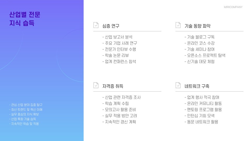 - 지속적인 기술 습득이 필요합니다. 최신 트렌드에 반영하세요.