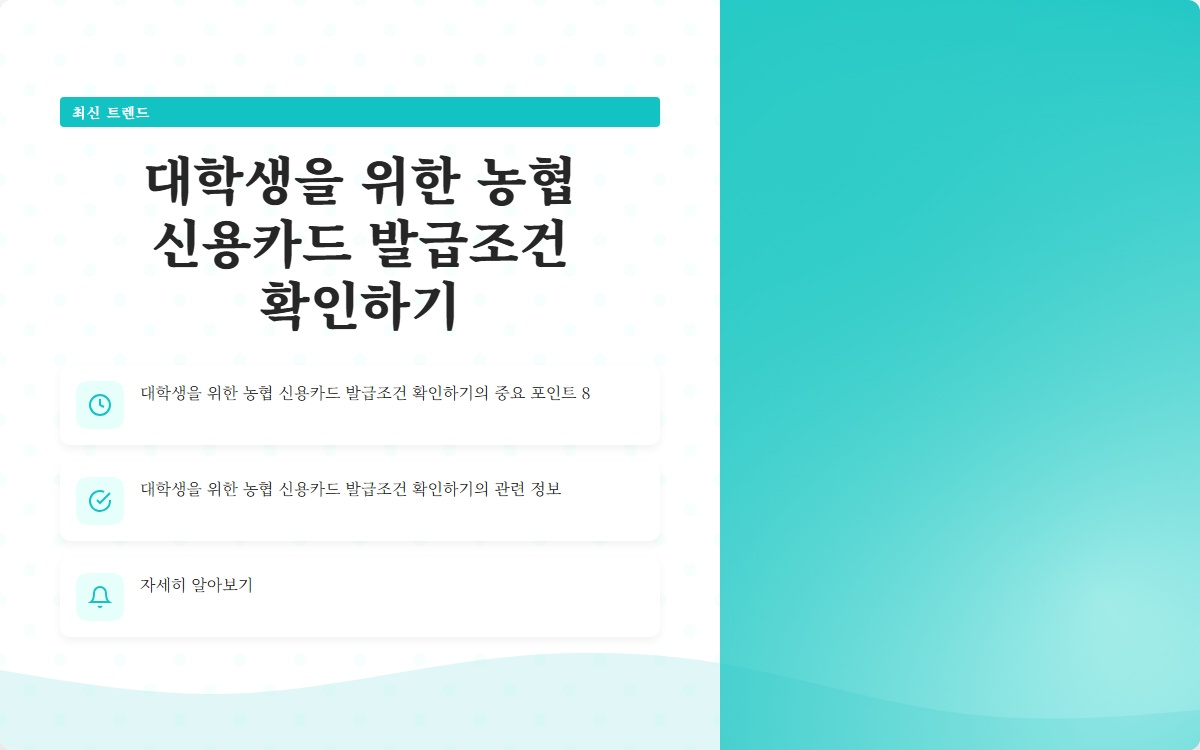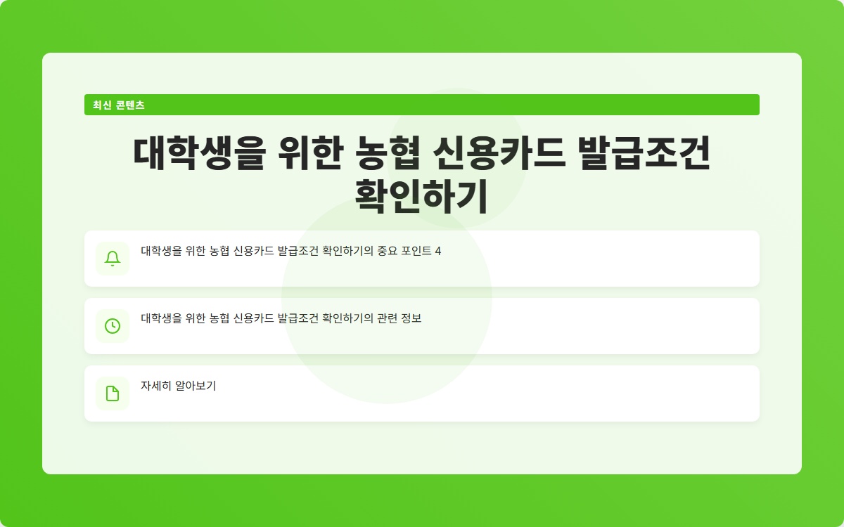 대학생들이 신용카드를 발급받으려면 여러 가지 조건을 충족해야 합니다. 신용카드는 일상 생활에서의 편리함을 제공하지만, 발급 조건을 잘 아는 것이 중요합니다. 특히 농협 신용카드는 대학생들에게 적합한 다양한 혜택을 제공하므로 많은 학생들이 관심을 가지고 있습니다. 이 글에서는 농협 신용카드의 발급 조건을 자세히 알아보겠습니다.