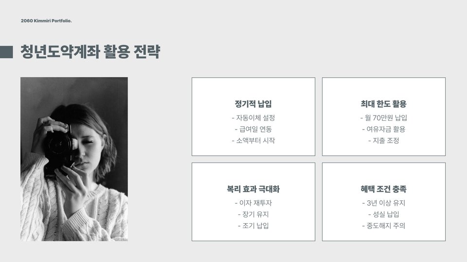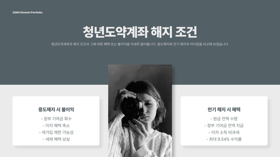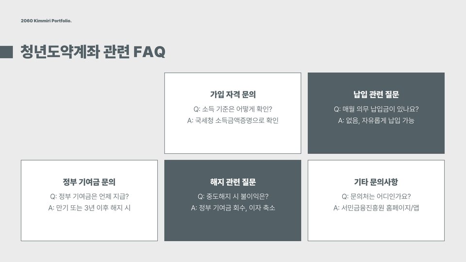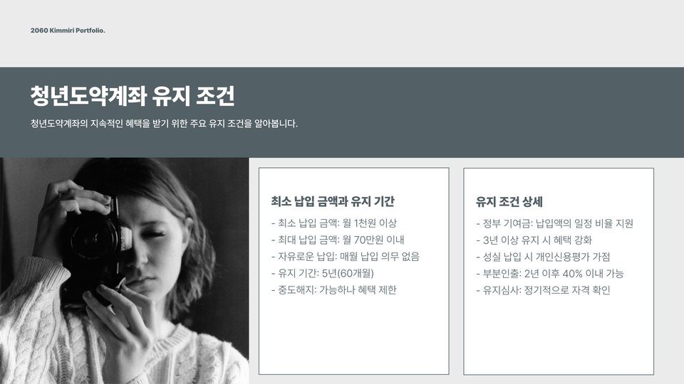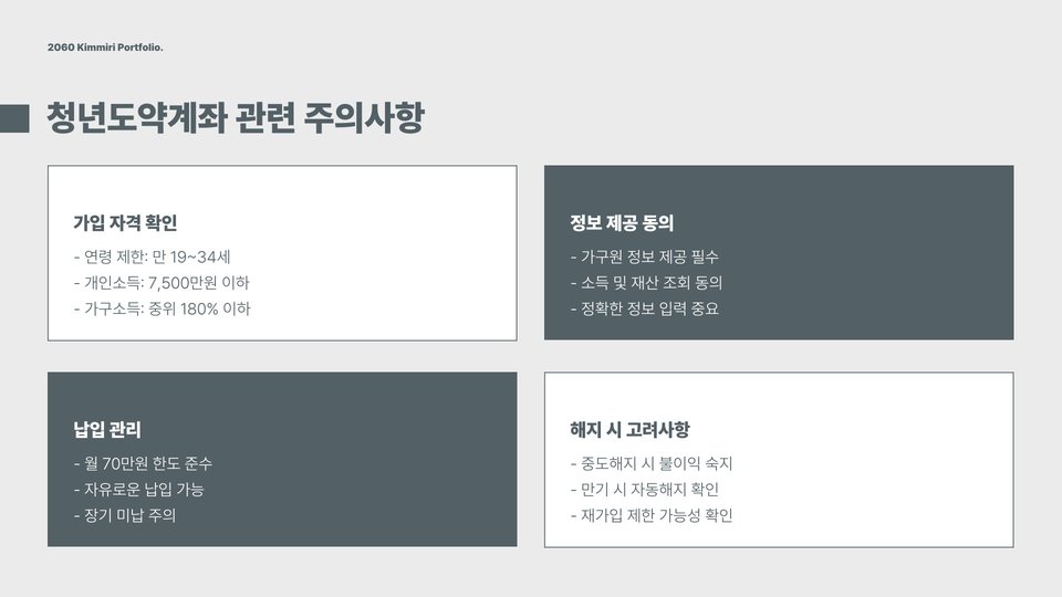 청년도약계좌의 가장 큰 장점은 정부의 지원금입니다. 청년들이 일정 금액을 적립하면, 정부가 추가 지원금을 제공하여 자산 형성을 돕습니다. 그러나 이 계좌는 장기적인 투자로, 중도 해지 시 불이익이 있을 수 있으니 주의해야 합니다. 또한, 신청자격과 조건을 다시 한번 확인해보고, 본인에게 가장 적합한 상품인지 판단하는 것이 중요합니다.