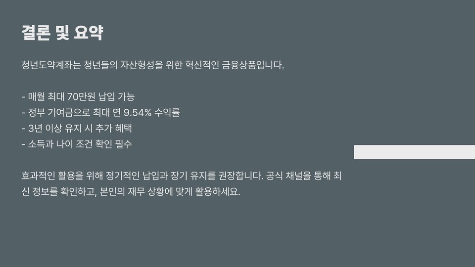 결론적으로, 청년도약계좌는 청년들이 미래를 준비하는 데 유용한 금융 상품입니다. 신청기간을 잘 확인하고, 필요한 자격을 충족하는지 미리 점검하는 것이 중요합니다. 청년 여러분의 경제적 독립을 응원하며, 올바른 선택을 통해 더 나은 미래를 준비하시기 바랍니다!