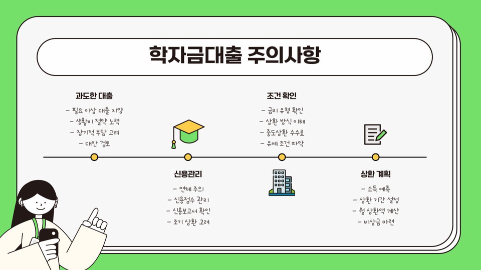 학자금대출을 이용하면서 가장 주의해야 할 점은 상환능력입니다. 학자금대출이 결국에는 반환해야 하는 금액이기에, 상환계획을 세우는 것이 중요합니다. 자신이 졸업 후 어떤 직업을 갖고 얼마나 벌지에 대한 예측을 바탕으로, 대출 상환 시기를 결정해야 합니다. 만약 상환 기간을 놓치게 되면 신용등급에 영향을 미칠 수 있습니다.